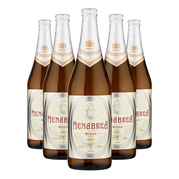 La Birra Menabrea Bionda e' una birra dal colore chiaro brillante con schiuma abbondante e di grana fine. Il sapore si fonde con grande equilibrio tra il fruttate e floreale. Il sapore e' equilibrato tra lo speziato e il maltato. Il finale ha una piacevole persistenza luppolata. Ingredienti: malto d'ORZO, mais, acqua, luppolo e lievito.