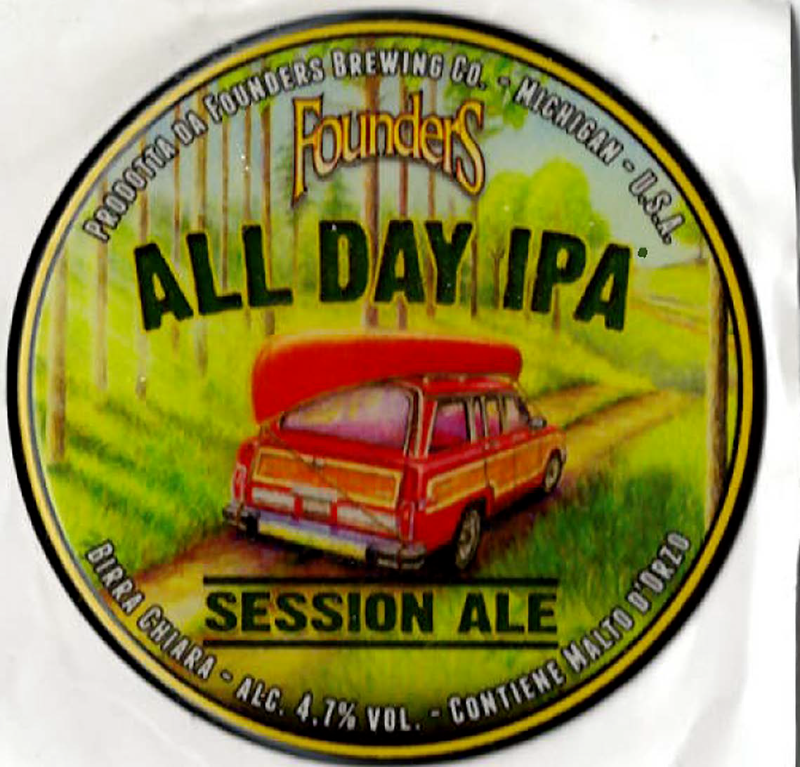 La Founders All Day Ipa è una famosissima session ipa americana. Dal colore biondo intenso, spigiona intensi profumi di agrumi e miele; il suo carattere amaro è sapientemente mediato dall'uso dei malti. I suoi sapori sono quelli classici delle session ipa; agrumi, pompelmo, note balsamiche e ovviamente luppolo.
