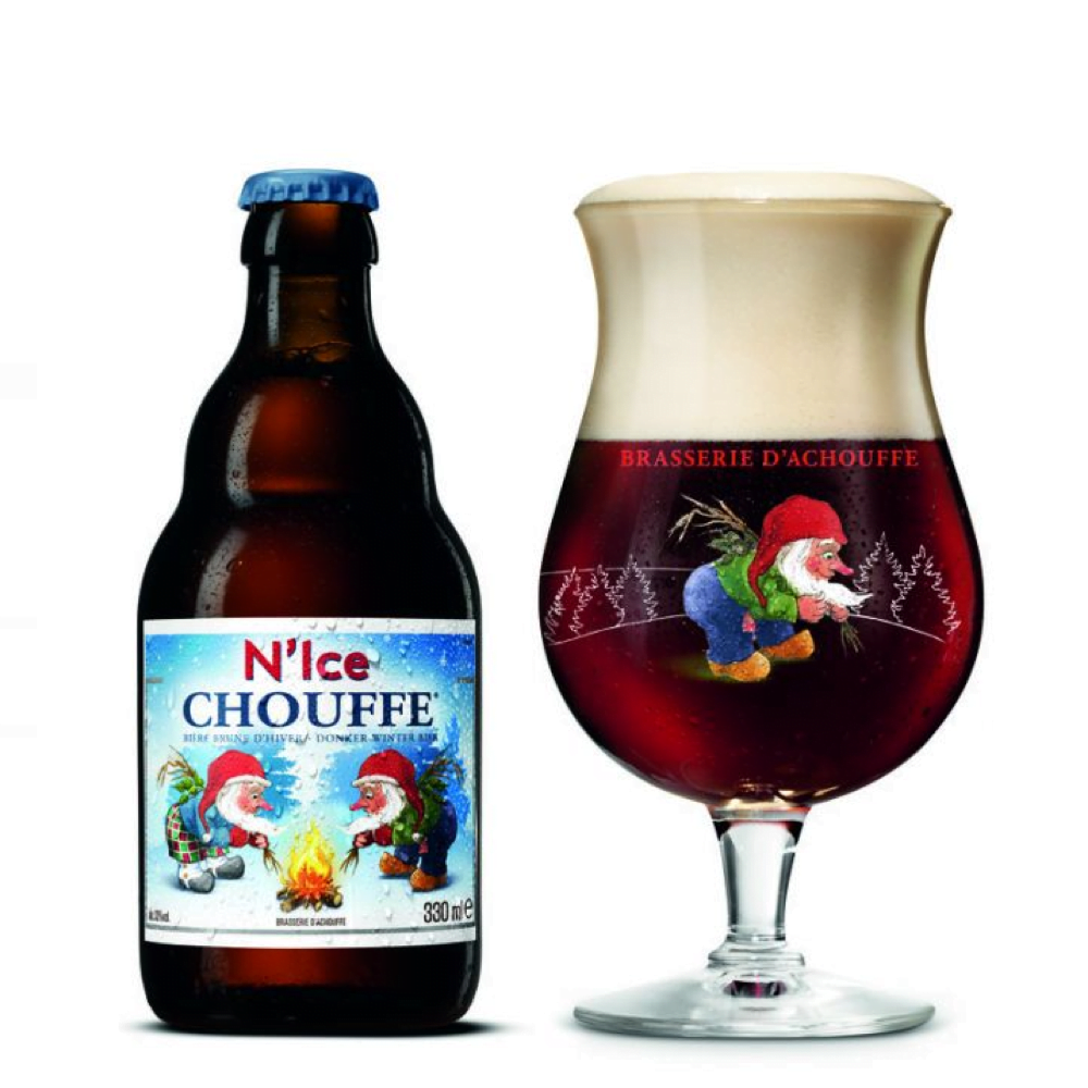 N'ICE CHOUFFE è la birra invernale del Birrificio Chouffe. Consigliamo di gustarla da metà ottobre a metà febbraio, preferibilmente davanti al caminetto. È una birra scura, leggermente luppolata, speziata con timo e curaçao, prodotta con buccia d'arancia. Ha una gradazione alcolica del 10%. N'ice CHOUFFE si abbina bene a qualsiasi piatto invernale.